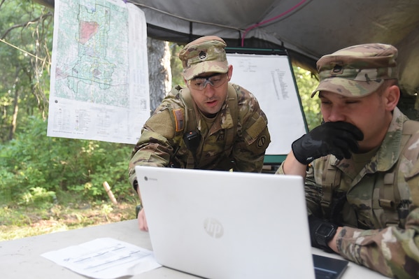 U.S. Army Reserve Staff Sgt. Ian Fairweather, left, Observer Coach Trainer, 1-338th Training Support Battalion, 85th U.S. Army Reserve Support Command, and Staff Sgt. Casey Newtols, Observer Coach and Trainer, 1-338th TSBN, review the 420th Military Police Company’s Standard Operating Procedure during the Spartan Warrior Three training exercise at Fort McCoy, Wisconsin, June 19, 2022. Fairweather serves as an Army Reserve Soldier in a multi-component partnership with First Army's 181 Multi-Functional Training Brigade. He joined the Army Reserve after completing a four-year contract as an active-duty Army infantry Soldier. Fairweather continues his service, as an observer coach/trainer, to assist Soldiers and units enhance their capabilities and readiness standards. Fairweather utilizes his job skills from both sides of his role as a Citizen-Soldier to benefit the Army as well as his civilian career. (U.S. Army Reserve photo by Staff Sgt. Erika Whitaker)